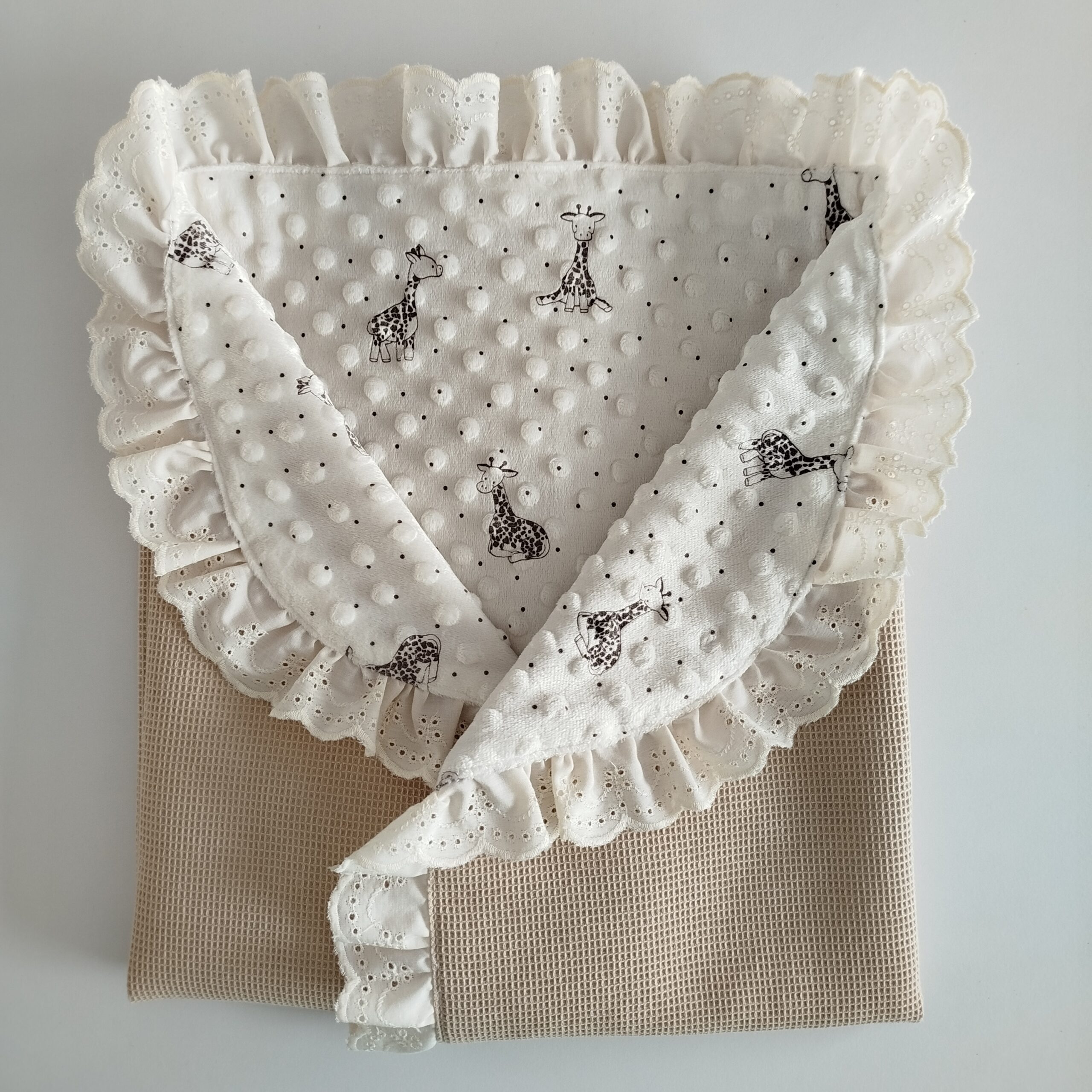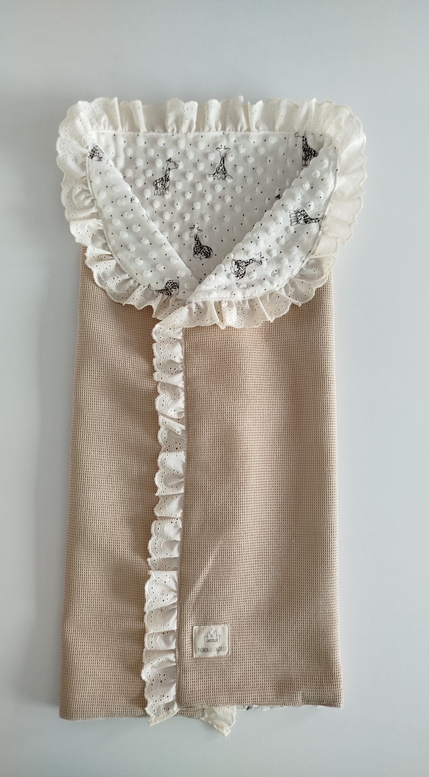 Arrullo reversible de invierno con pique de waffle, el interior de coralina con dibujo de jirafas.