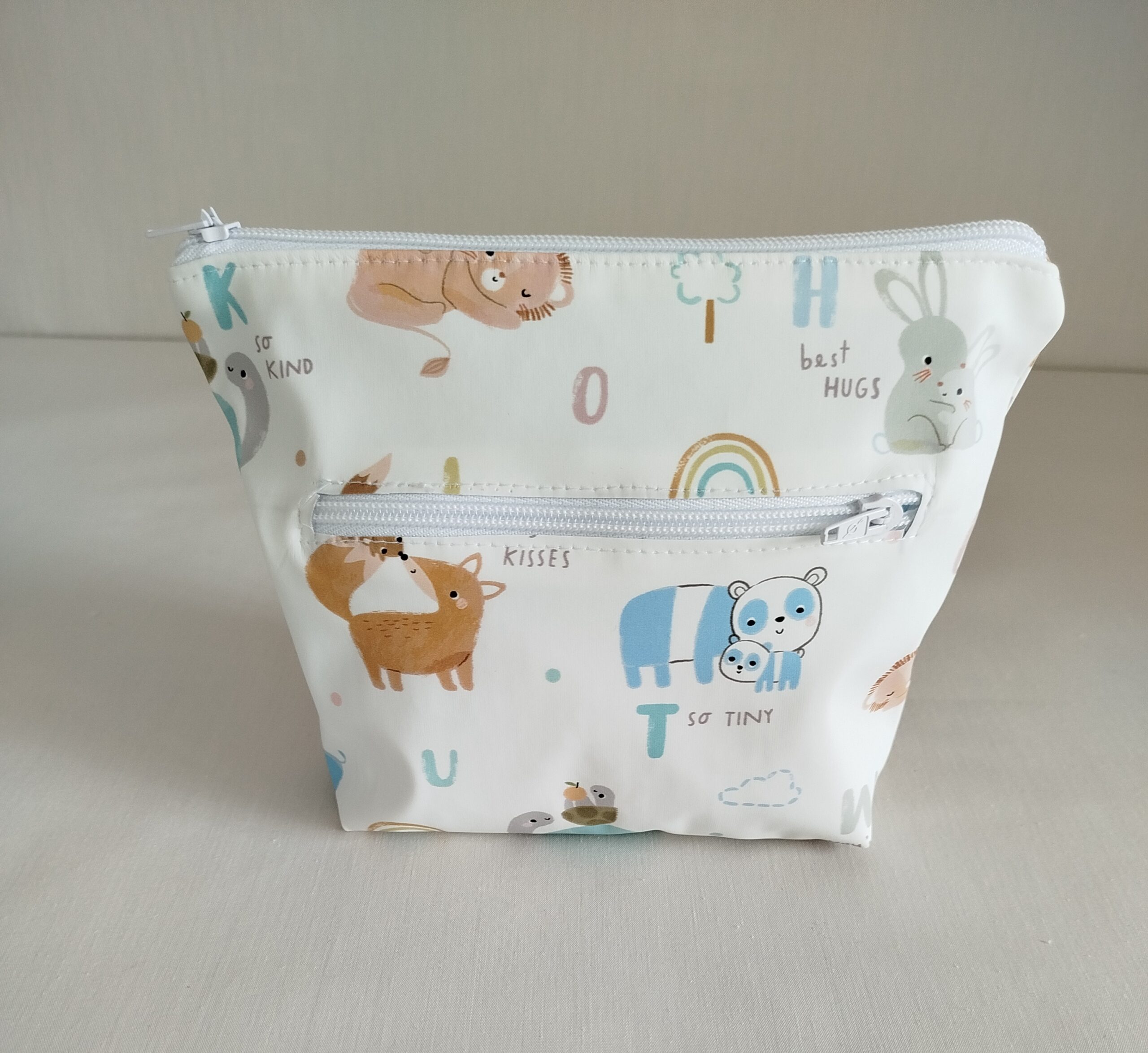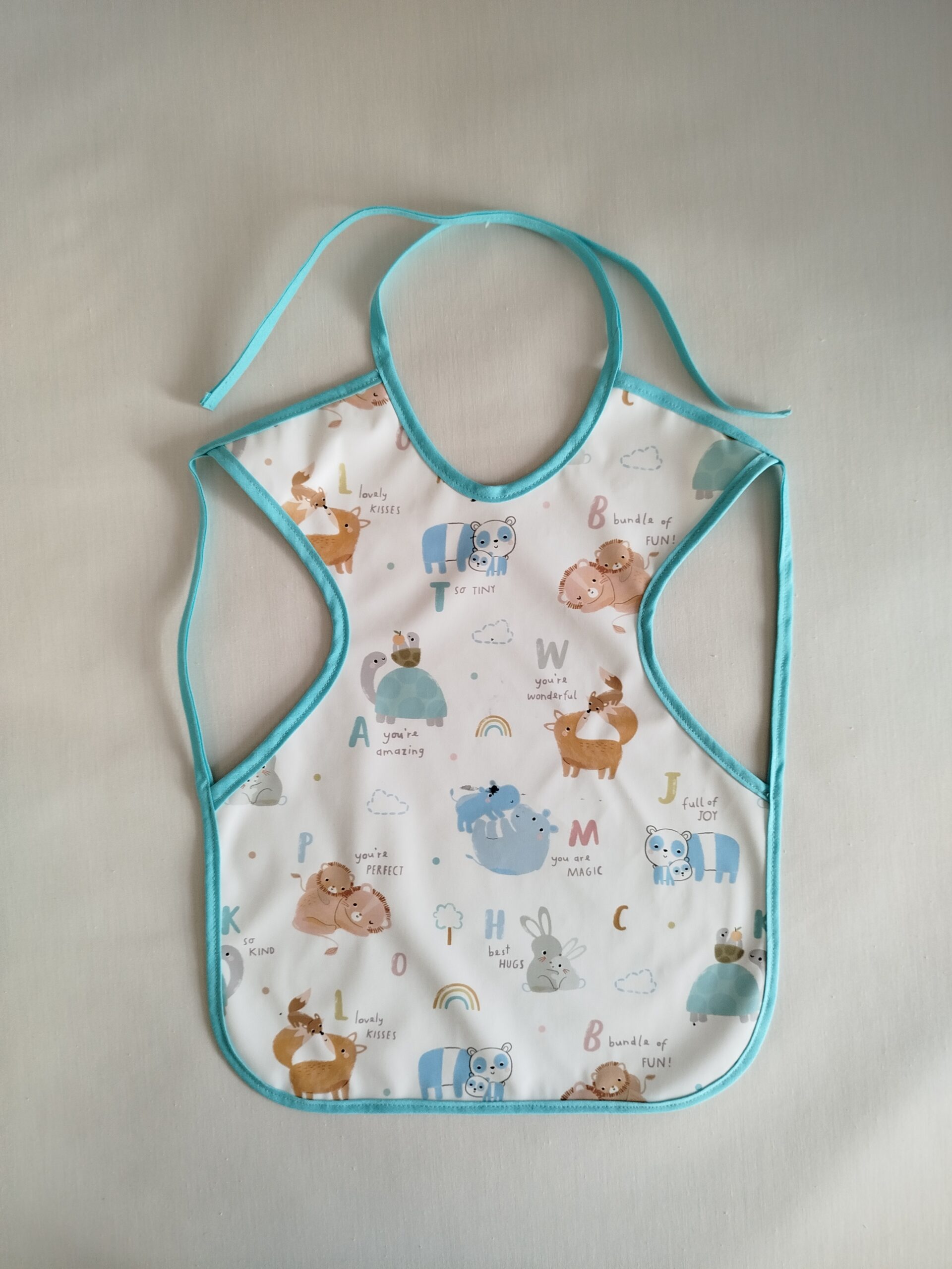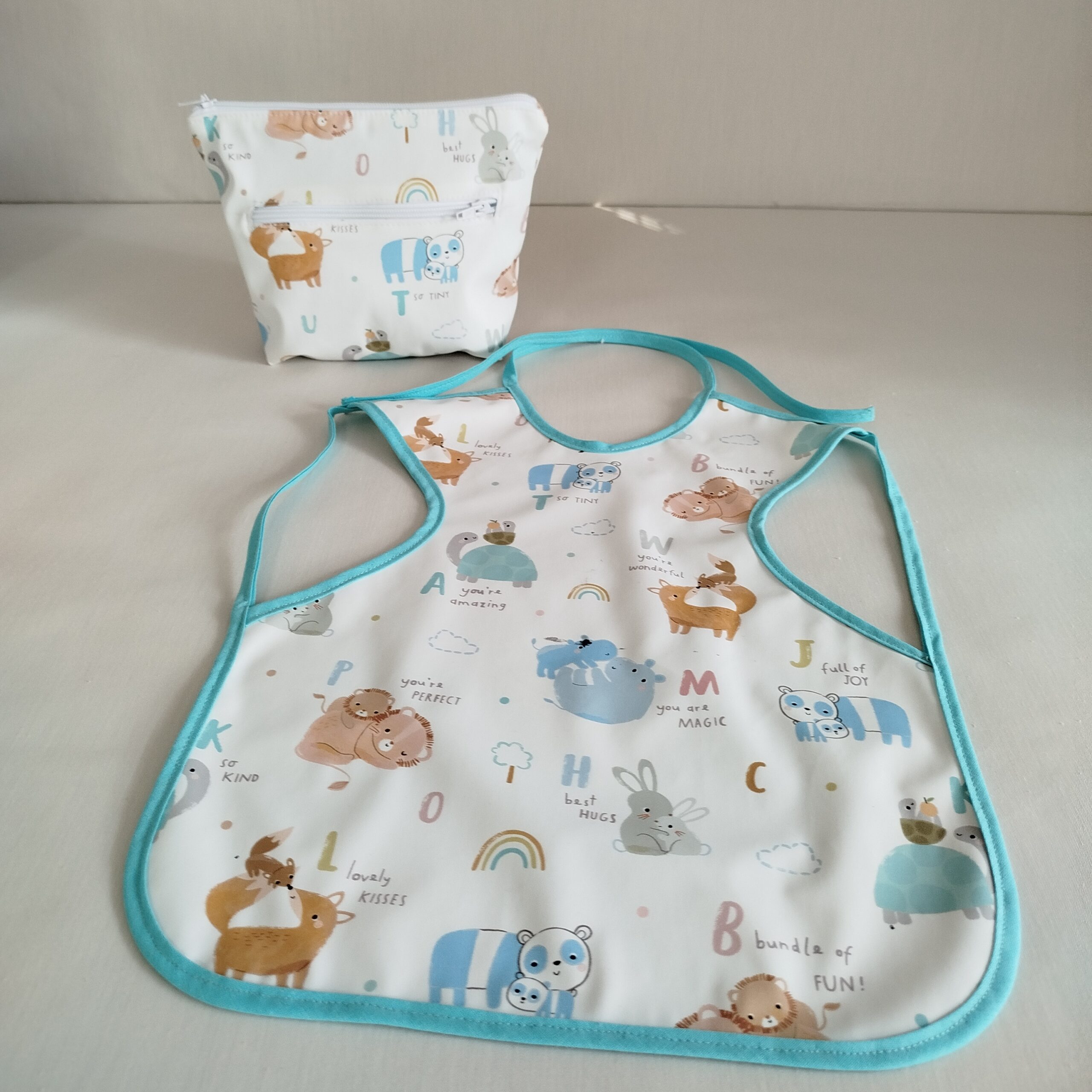 Babero y neceser de animalitos con tejido plastificado muy suave.