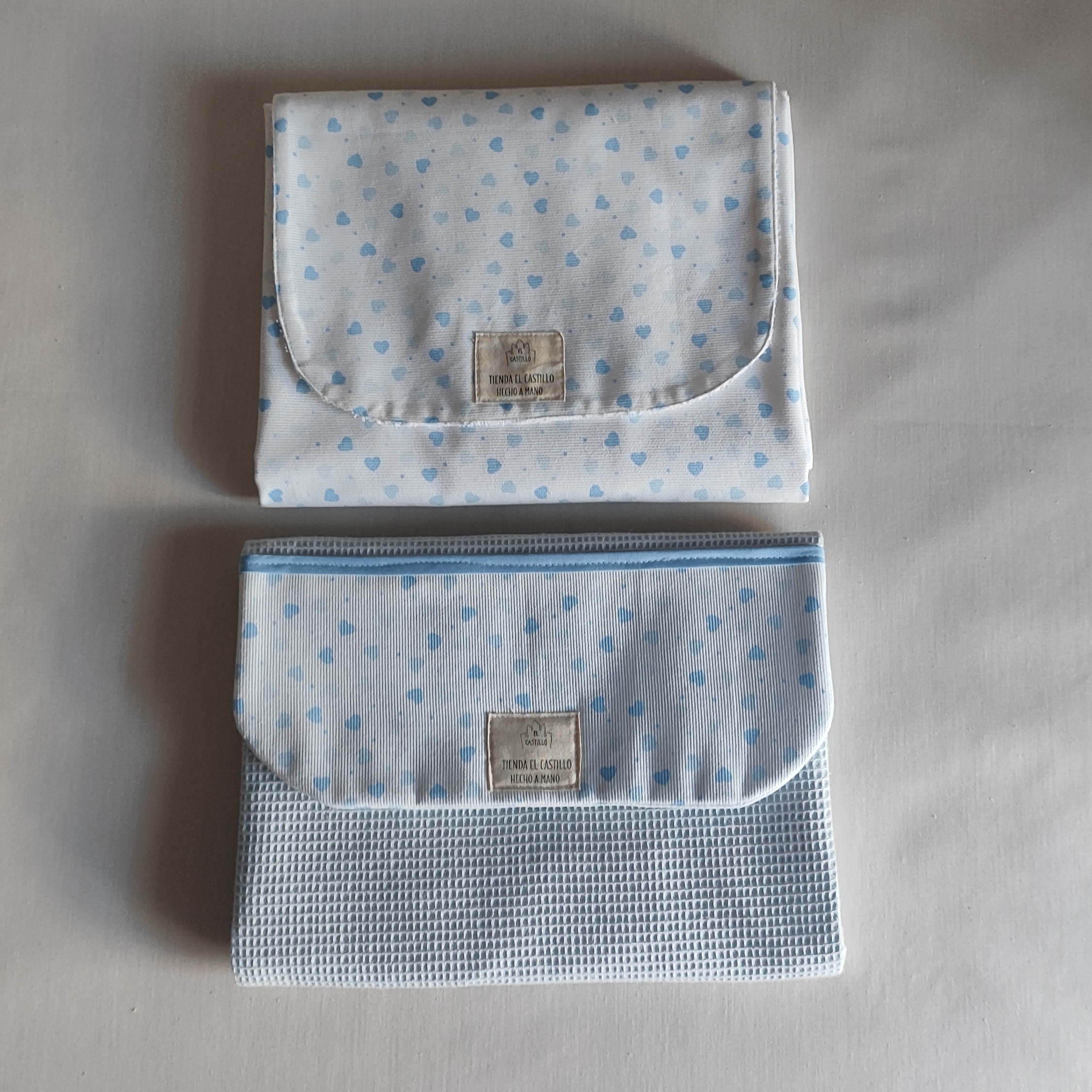 Hechos a mano con tejido de  piqué con estampado de corazones y tejido de waffle azul.