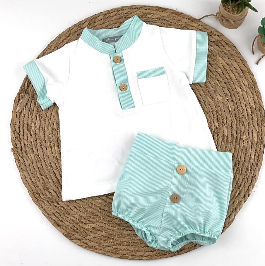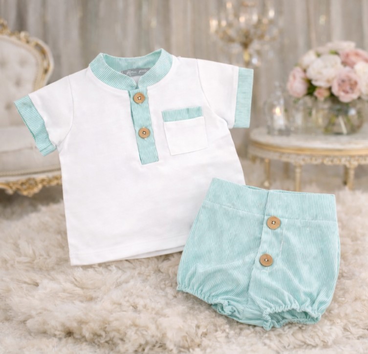 Conjunto de bebé compuesto por camiseta y pantalón corto, diseñado con un estilo fresco, elegante y muy cómodo para el verano. La camiseta, confeccionada en tejido suave y agradable al tacto, presenta cuello tipo mao, tapeta con botones y bolsillo frontal, todos ellos rematados en tejido de rayas en tono verde agua, aportando un contraste delicado y actual. Las mangas también van rematadas en el mismo tejido coordinado. El pantalón corto, con cinturilla elástica y pernera ligeramente abombada, está realizado en tejido de rayas a juego, incorporando botones decorativos en el frontal que completan el conjunto con un acabado cuidado y armonioso.