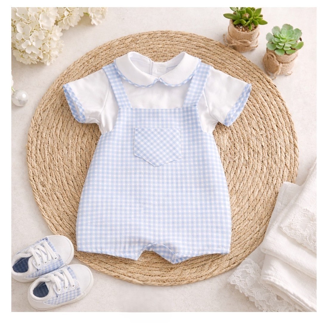 Conjunto de bebé formado por peto corto y blusa a juego, diseñado para un look delicado y cómodo en los primeros meses. El peto presenta un suave tejido de cuadro vichy en tono azul claro, con tirantes y bolsillo central que aportan un aire clásico y elegante. La blusa blanca de manga corta incorpora cuello redondo con vivo a juego, aportando un acabado cuidado y armonioso.