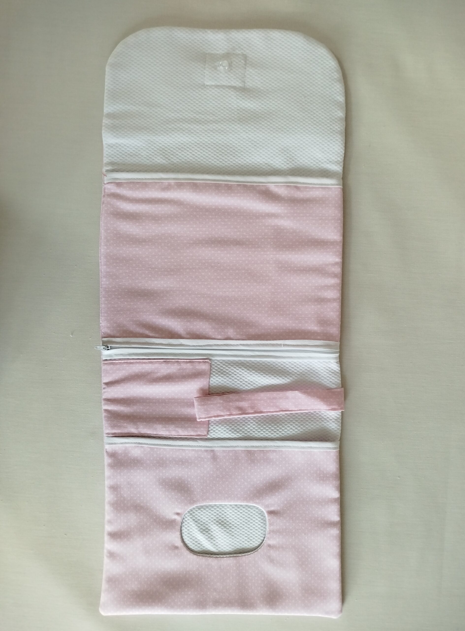 Es un básico para los bolsos de bebé ya que tienen un tamaño ideal para poder llevarlo a todas partes. Además, tiene capacidad para guardar: pañales, un paquete de toallitas, un bote de crema y un pequeño espacio donde enganchar el chupete para llevarlo todo junto.