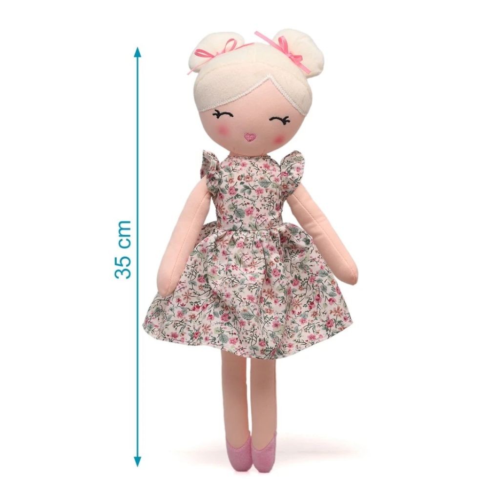 Preciosa muñeca de trapo para bebé con vestidido de flores y lazito en el pelo rubio. Suave blandita y muy ligera pensada para convertirse en al compañera ideal del bebé.