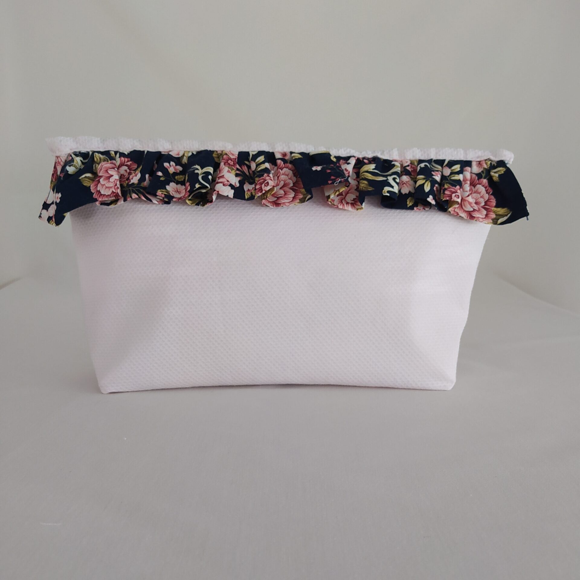 Neceser confeccionado con tejido de piqué rosa adornado con un volante estampado.