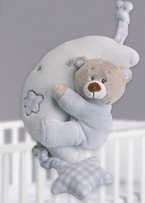 Peluche musical infantil de la marca Gamberritos. Ayuda a relajar al bebé con su melodia. Tacto dulce aterciopelado. Detalles bordados en el diseño. Preparado para colgar.