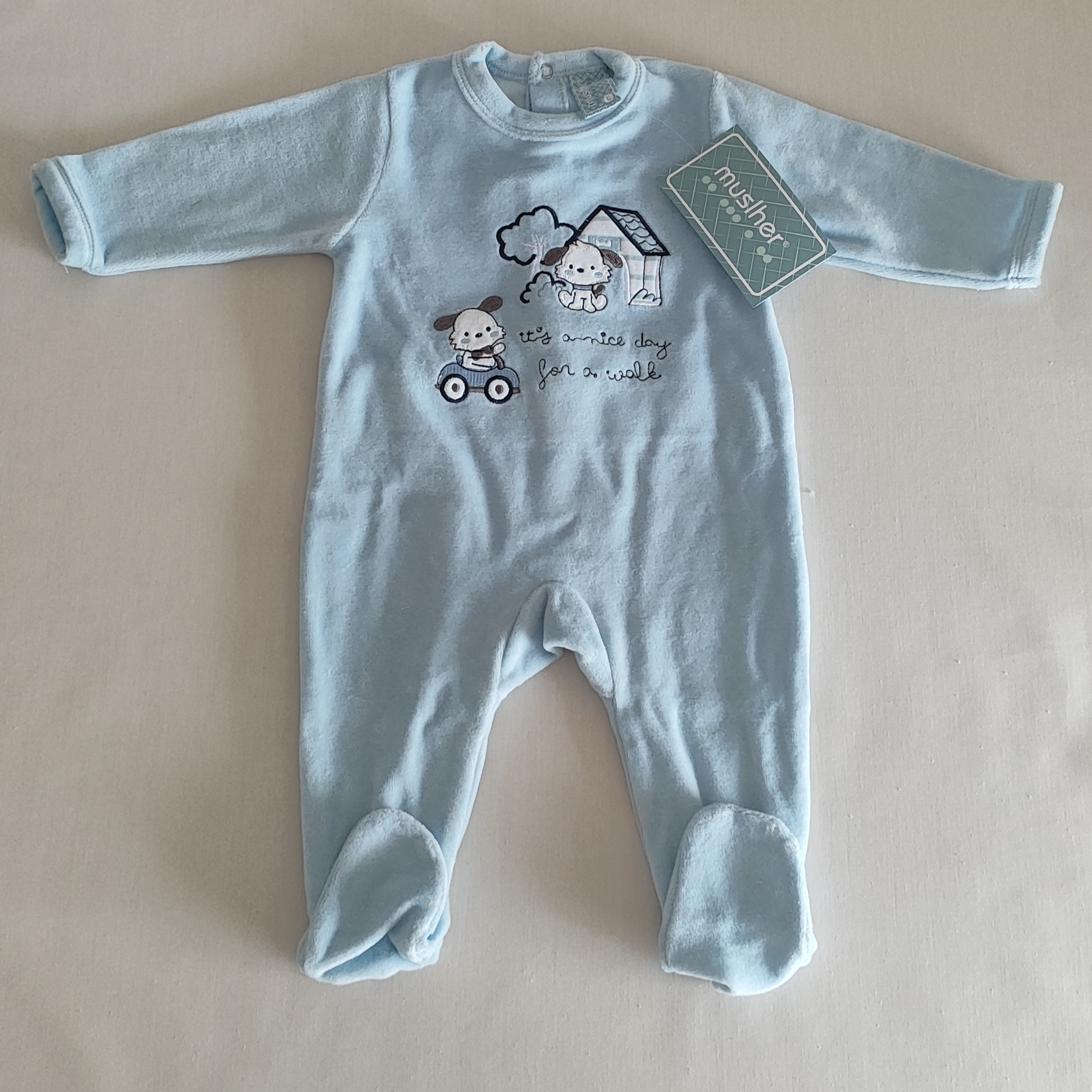 Pijama azul de  bebé con dibujo bordado de perritos.