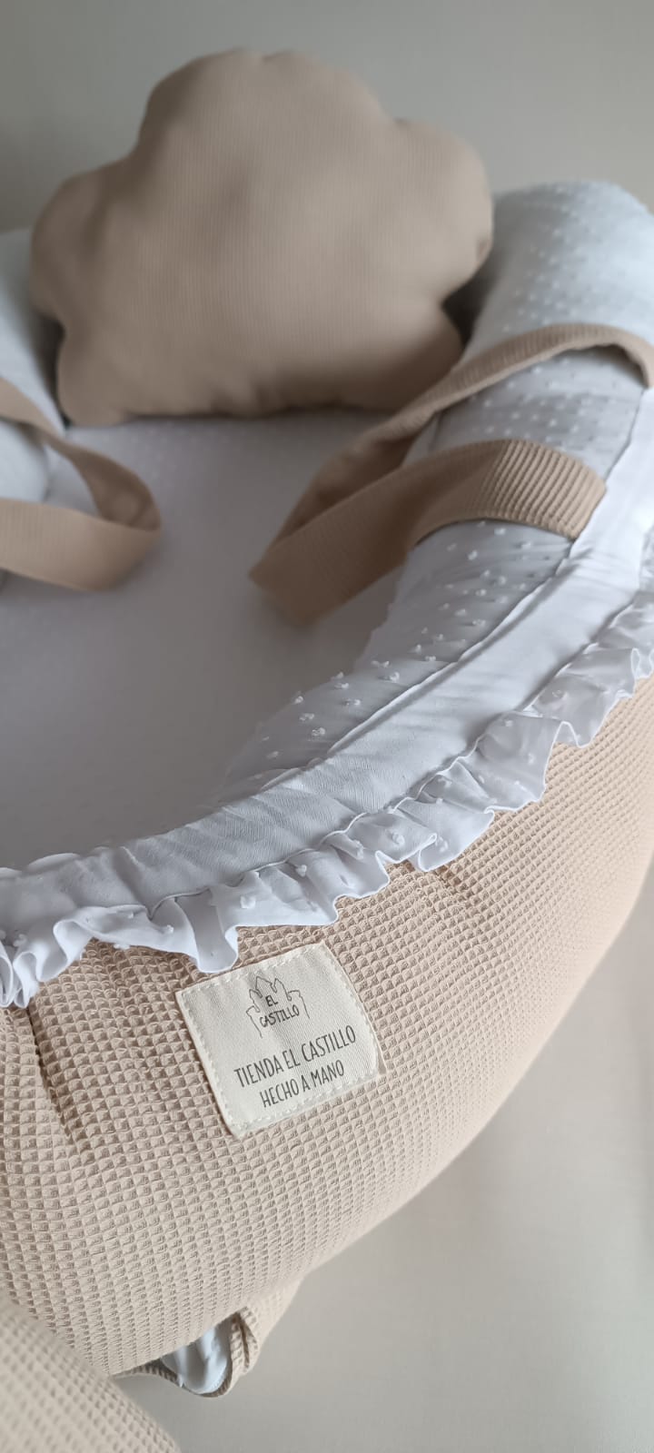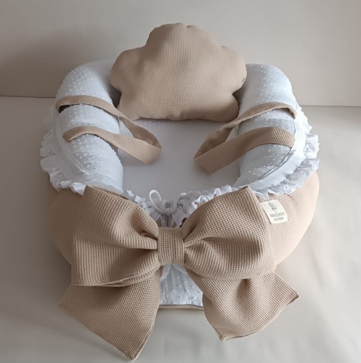 Reductor de cuna con asas, lazo y almohada con forma de nube.