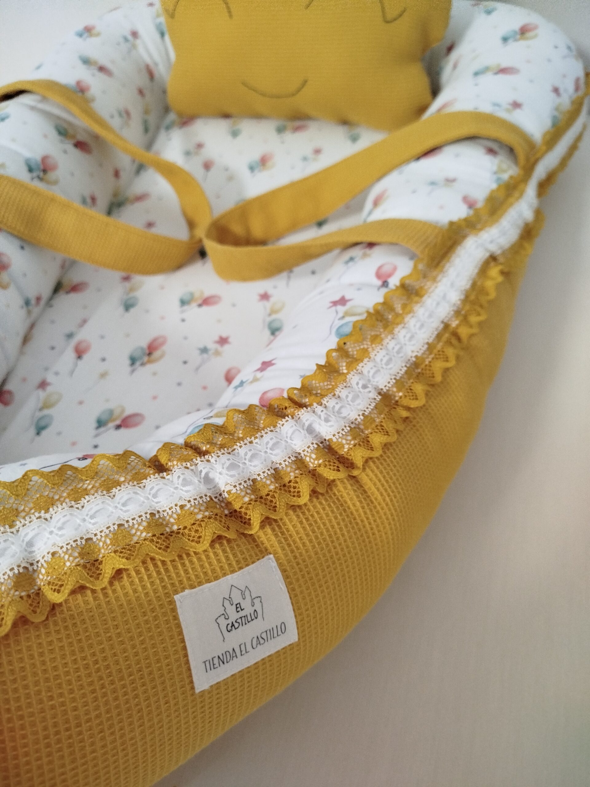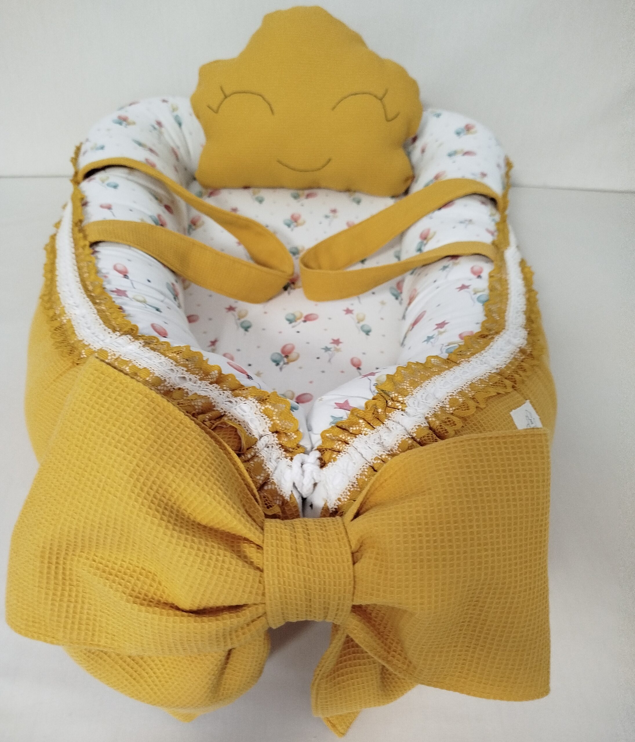 Reductor de cuna con asas, lazo y almohada con forma de nube.