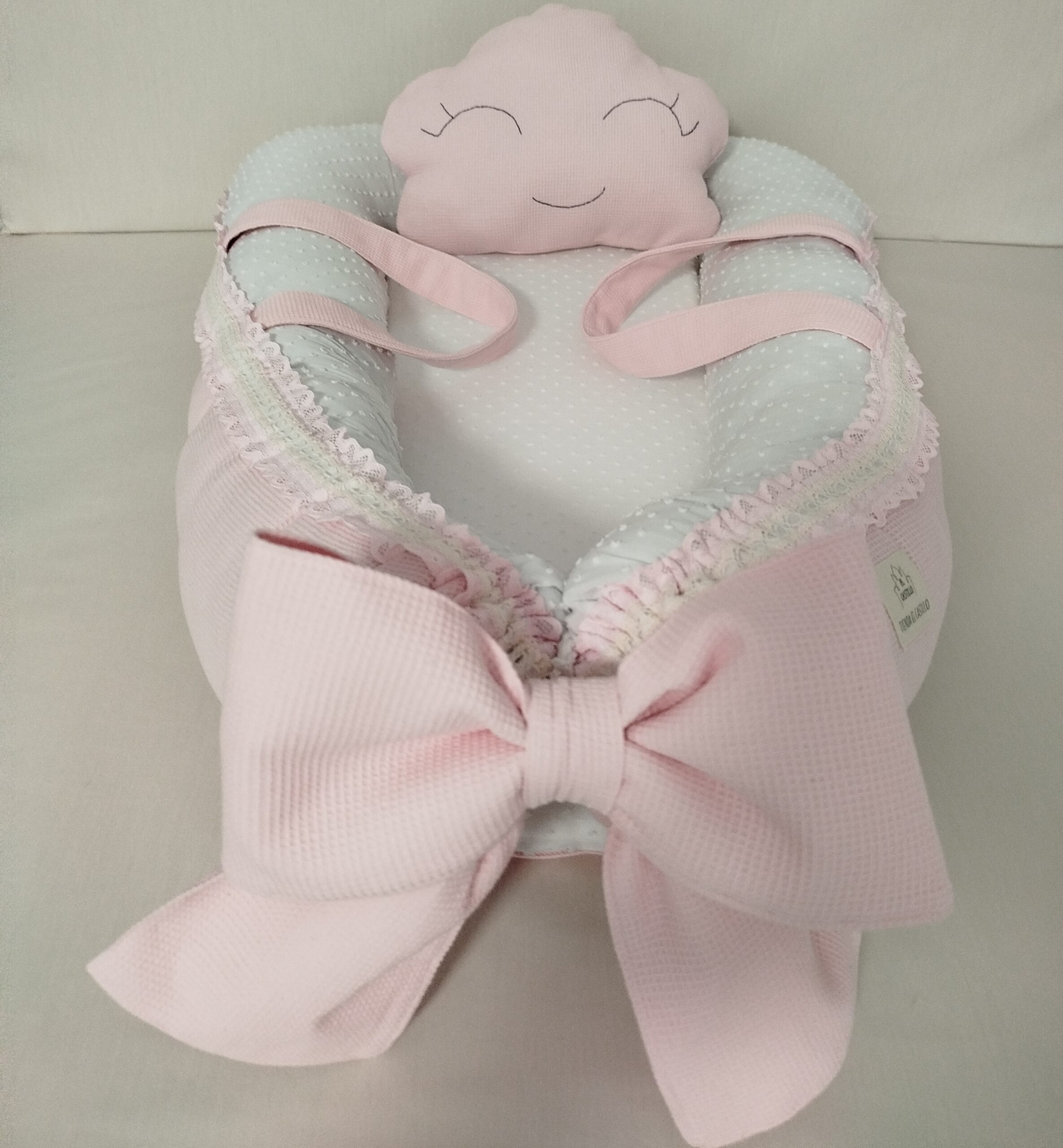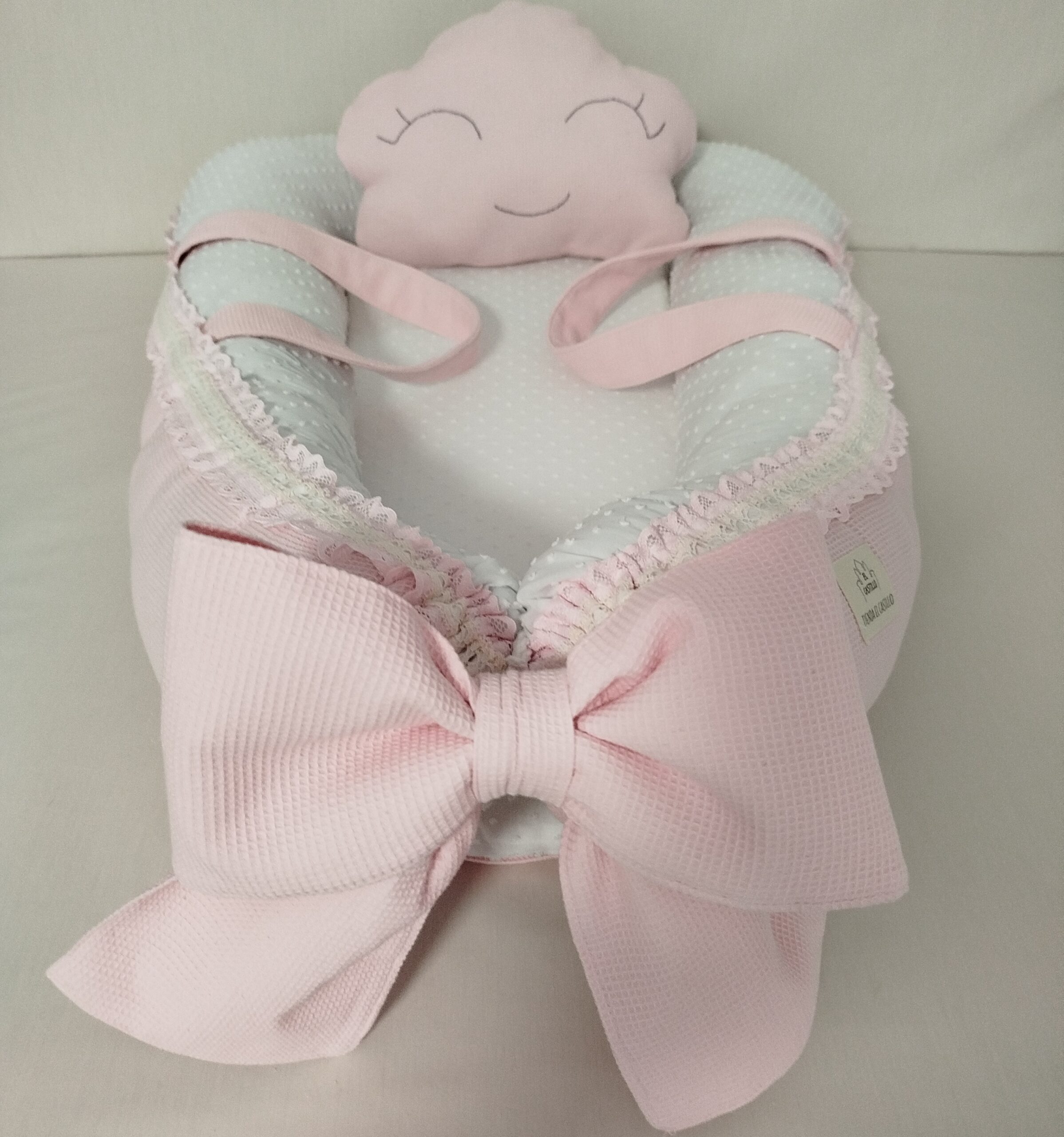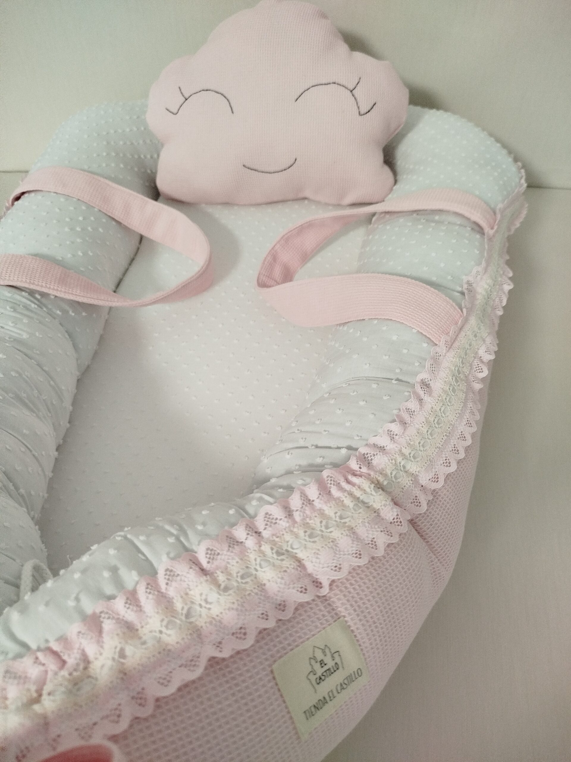 Reductor de cuna con asas, lazo y almohada con forma de nube.