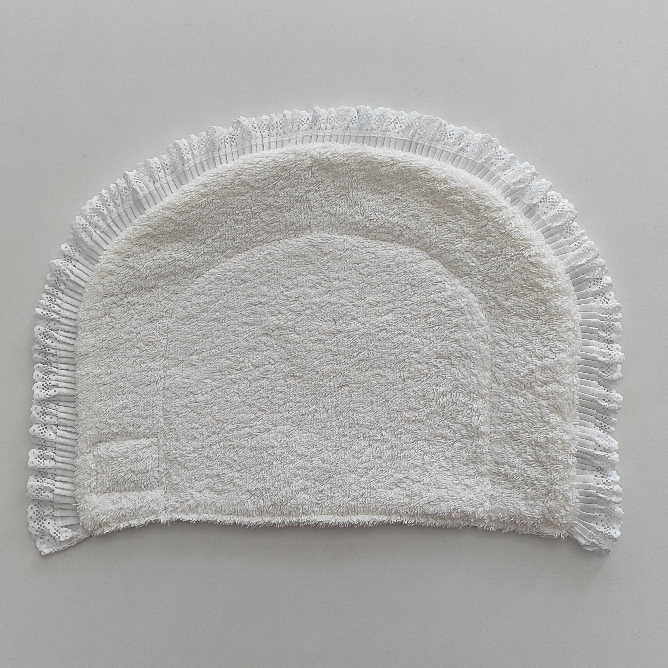 Está confeccionado con tejido de pique, encaje y  por la parte trasera con tejido de rizo para hacerlo más absorbente.