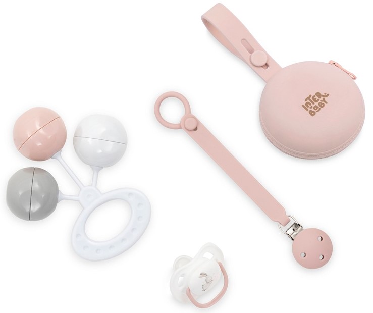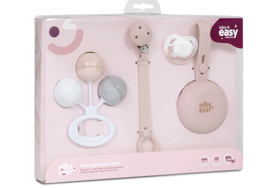 Set de regalo que contiene 4 piezas de la marca Interbaby. Contiene: 1 sonajero, 1 chupete, 1 chupetero y 1 porta chupete. Libre de BPA, PVC y ftalatos.