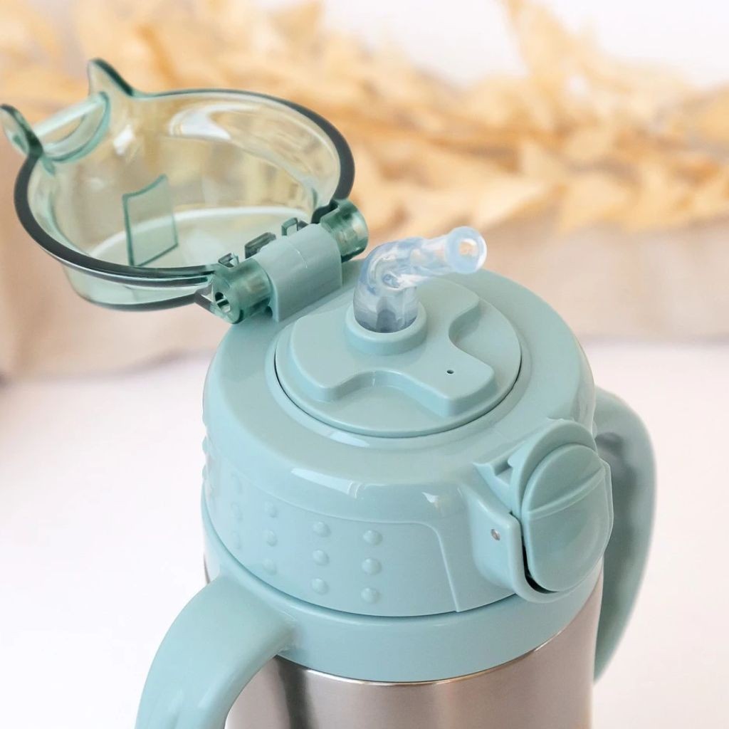 Botella taza de acero inoxidable con pajita de silicona incorporada. Lleva asas y mantiene la bebida 10 horas caliente o 12 horas si esta fría. Se acciona con un simple botón y lleva tapa incorporada.