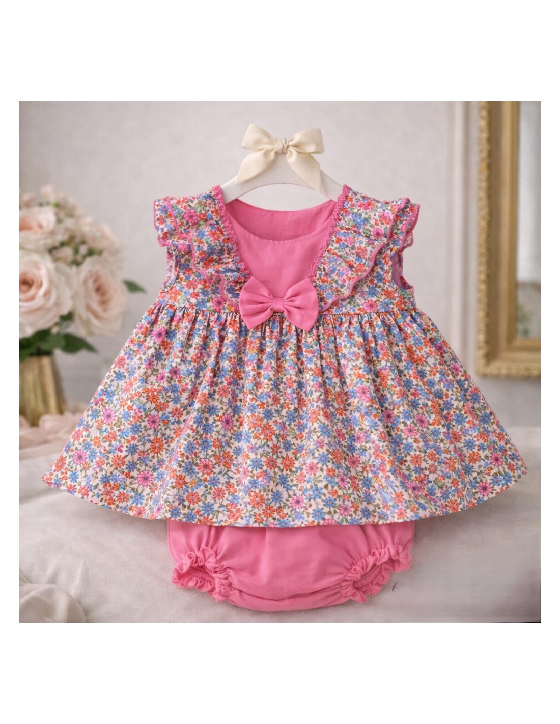 El vestido presenta estampado floral en tonos vivos, con escote redondo y volantes en los hombros rematados en contraste. Detalle de lazo central en color rosa chicle, a juego con la braguita.